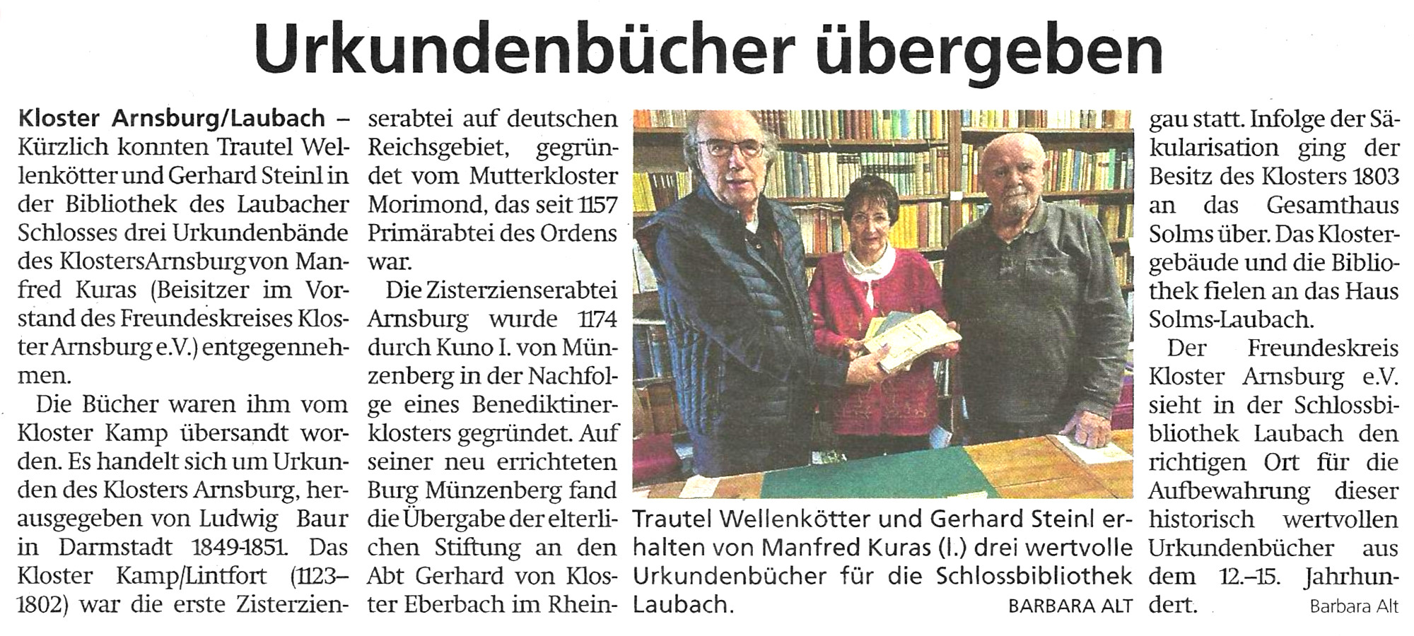 Kürzlich konnten Trautel Wellenkötter und Gerhard Steinl in der Bibliothek des Laubacher Schlosses drei Urkundenbände des Klosters Arnsburg von Manfred Kuras (Beisitzer im Vortand des Freundeskreises Kloster Arnsburg e. V.) entgegennehmen. ...weiter lesen
